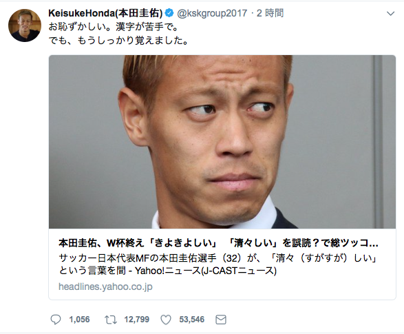 本田圭佑選手(32)が、「清々(すがすが)しい」を「きよきよしい」と読んでいた件について、ツイッターで反応した。曰く、漢字が苦手だという。