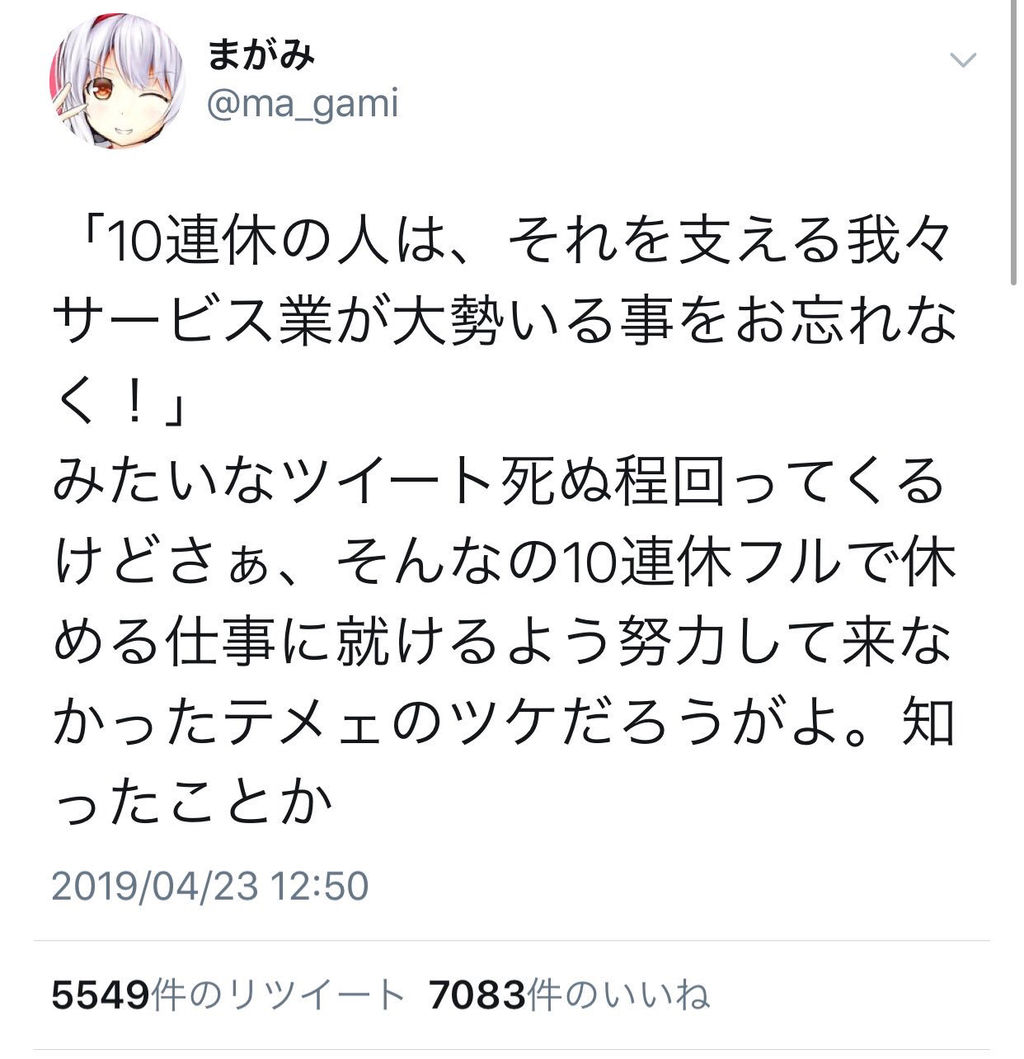 ツイ民、怒りの正論 「サービス業の人は10連休なんて不可能?今まで努力を怠って来たツケだろ!