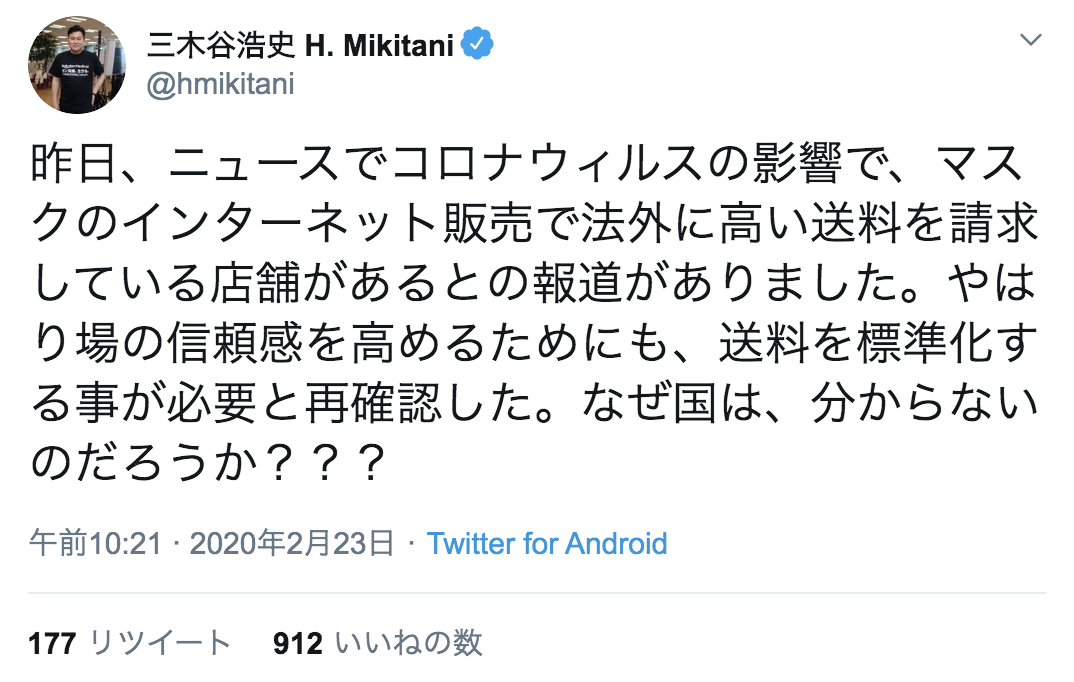 楽天・三木谷社長「マスクの送料が高い店舗がある。やはり送料を標準化する事が必要と再確認した。国はなぜ分からないか?」
