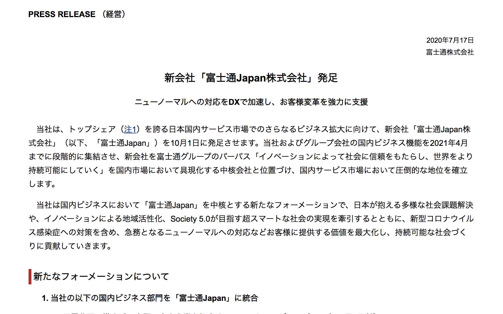 富士通は7月17日、新会社「富士通Japan」を10月1日に設立すると発表した。