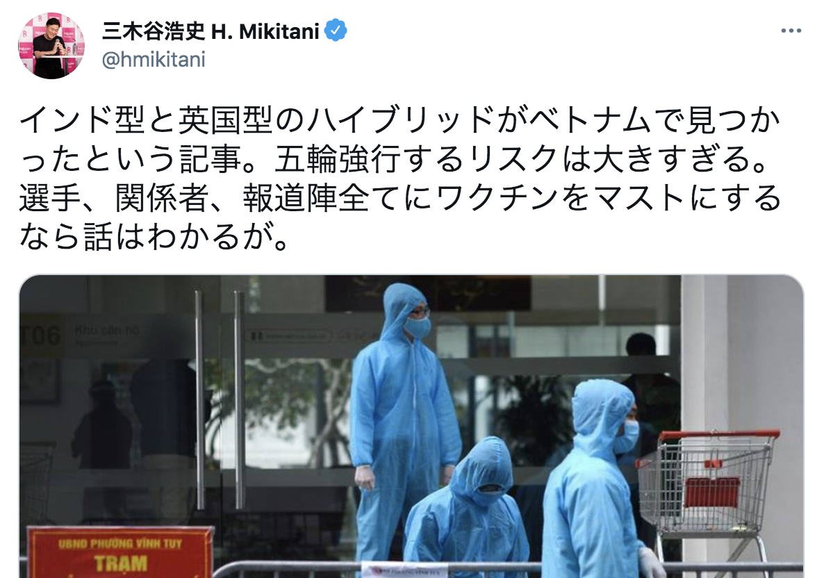 この記事を受け三木谷氏は「インド型と英国型のハイブリッドがベトナムで見つかったという記事」とした上で「五輪強行するリスクは大きすぎる。選手、関係者、報道陣全てにワクチンをマストにするなら話はわかるが」とツイートしていた。
