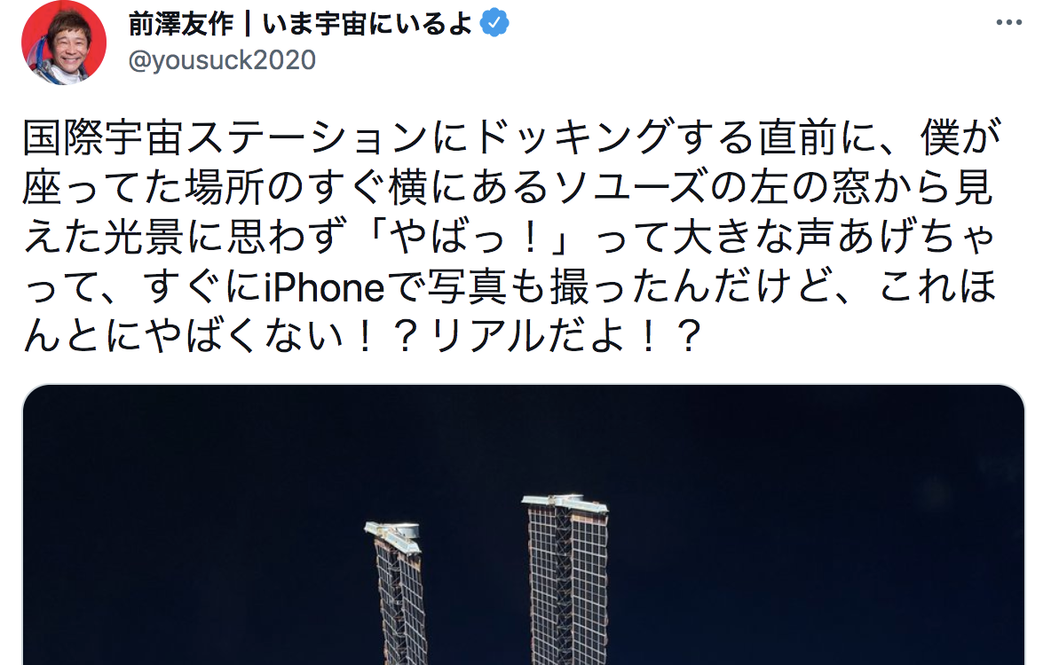 国際宇宙ステーションにドッキングする直前に、僕が座ってた場所のすぐ横にあるソユーズの左の窓から見えた光景に思わず「やばっ!」って大きな声あげちゃって、すぐにiPhoneで写真も撮ったんだけど、これほんとにやばくない!?リアルだよ!? pic.twitter.com/5yP3RGBTtc