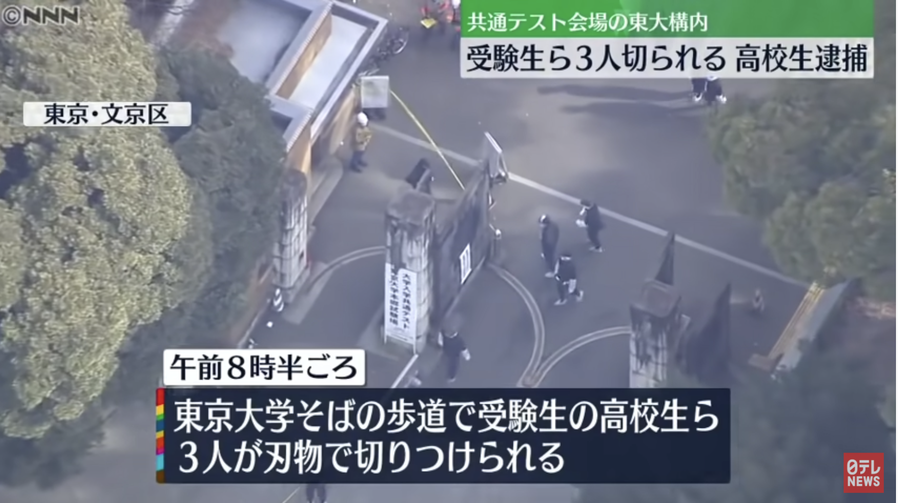 15日朝、大学入学共通テスト会場の東京大学の前で高校生ら3人が刃物で切りつけられた事件で、
