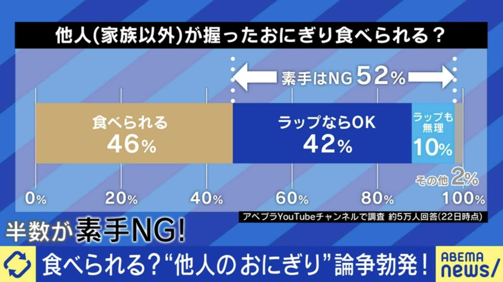 ネット上でたびたび話題になる、この「おにぎり」問題。番組で実施したアンケートに約5万人が回答したが「食べられる:46%」「ラップならOK:42%」「ラップも無理:10%」「その他;2%」と、「素手はNG:52%」という、真っ二つの結果となった…