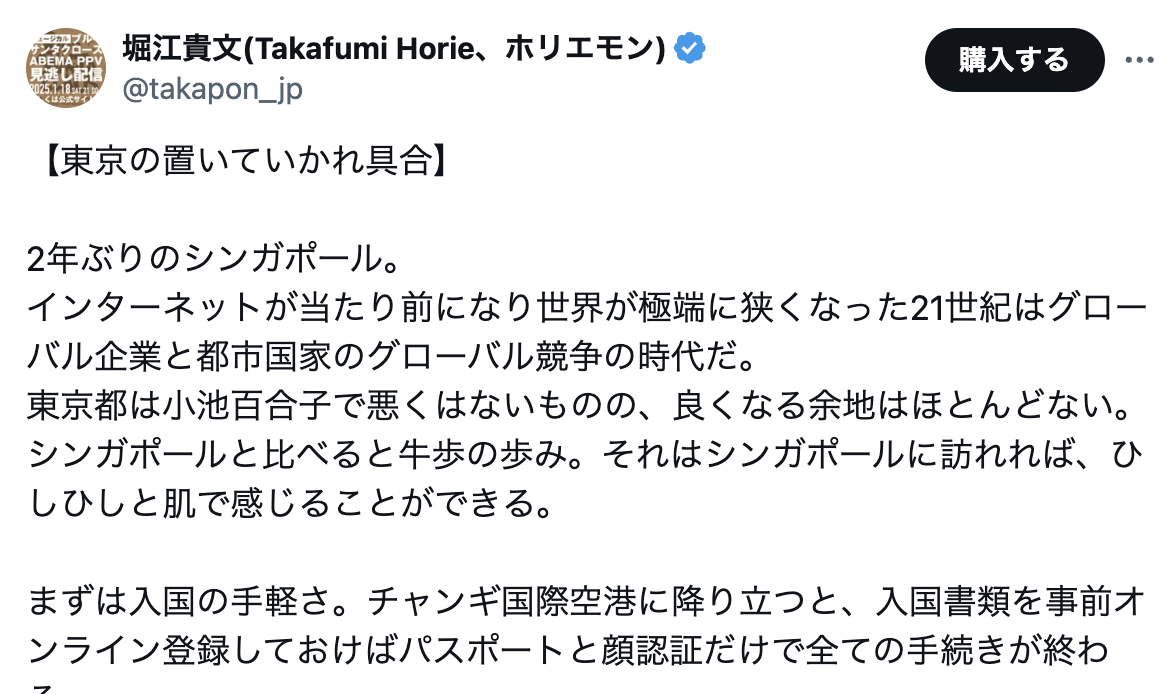 堀江氏は「【東京の置いていかれ具合】」と切り出すと、2年ぶりに訪れたシンガポールの感想を投稿。