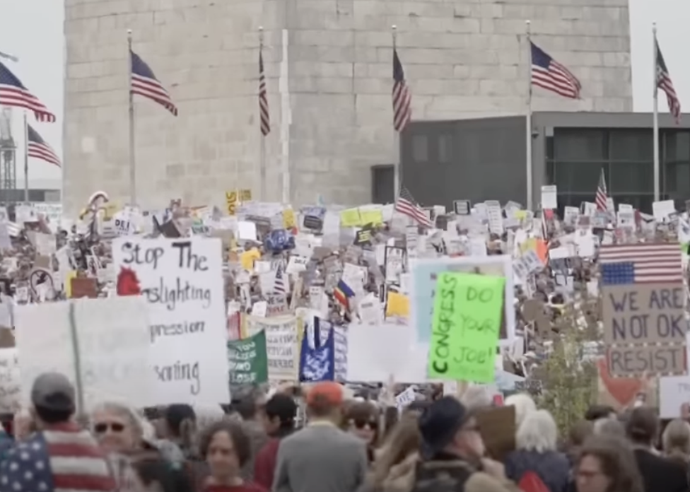 主催団体によると全50州で約60万人が参加登録し、第2次トランプ政権発足後では最大規模。首都中心部のワシントン記念塔周辺には数万人が集まり、「トランプ(大統領)は退陣しろ」とシュプレヒコールを上げた。