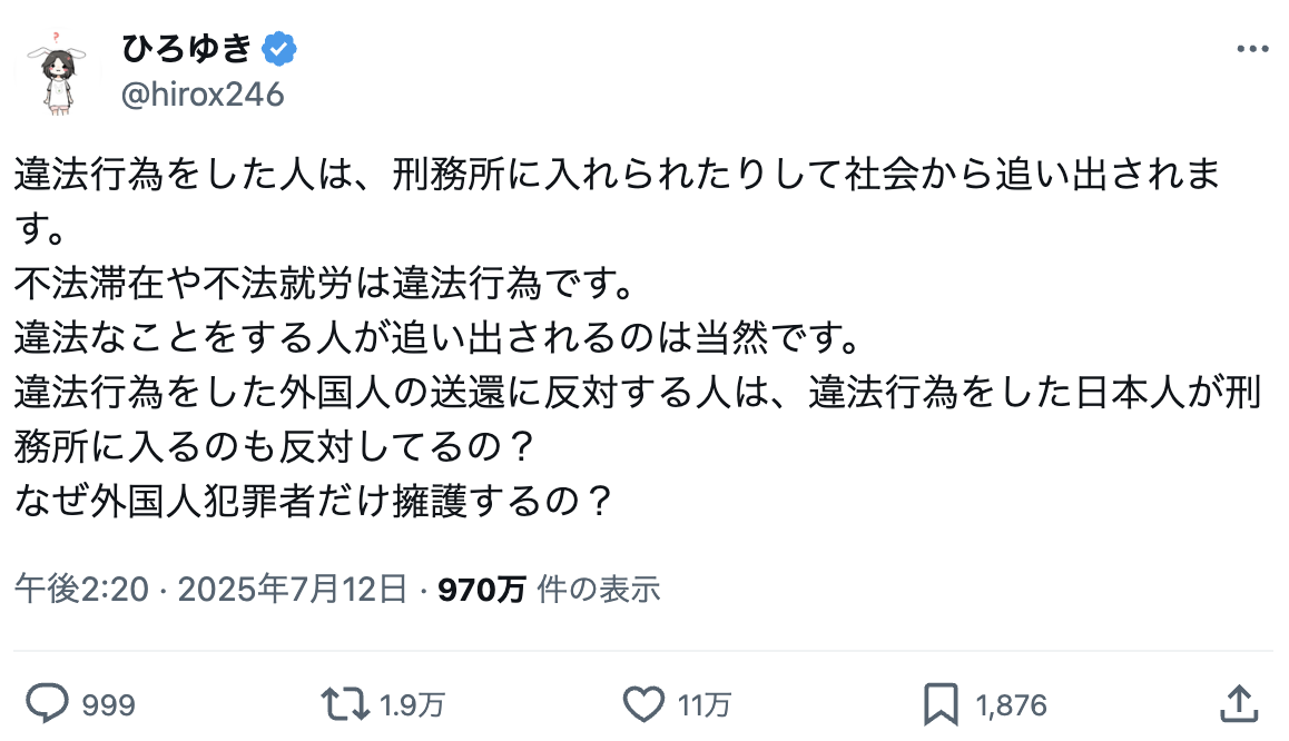なぜ外国人犯罪者だけ擁護するの?— ひろゆき (@hirox246) July 12, 2025