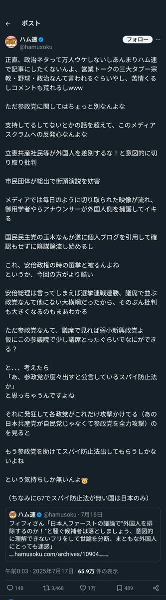 参院選で大きな争点が外国人を巡る政策ということで、SNSでは私の切り抜き動画がバズっているようだけど、日本に長く暮らし、この国に精通している私には取材の依頼が全然来ない。テレビに呼ばれるのは、不良外国の取り締まり強化を差別とすり替え排外主義と批判する外国人ばかり、話聞いて欲しいな〜