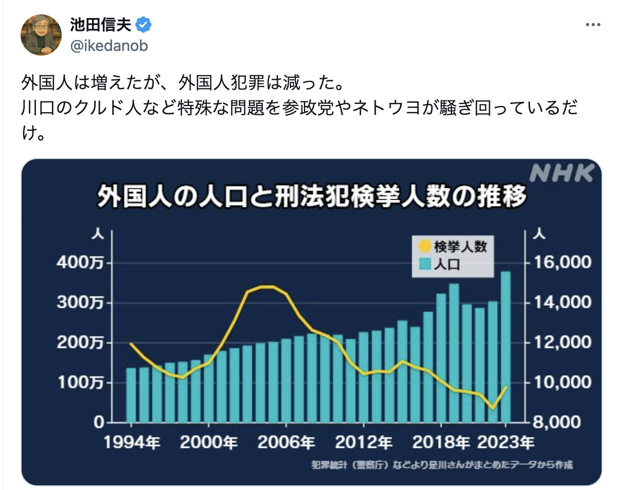 川口のクルド人など特殊な問題を参政党やネトウヨが騒ぎ回っているだけ。 https://t.co/hErSHt4mqz pic.twitter.com/zrN3Pix2iG— 池田信夫 (@ikedanob) July 16, 2025
