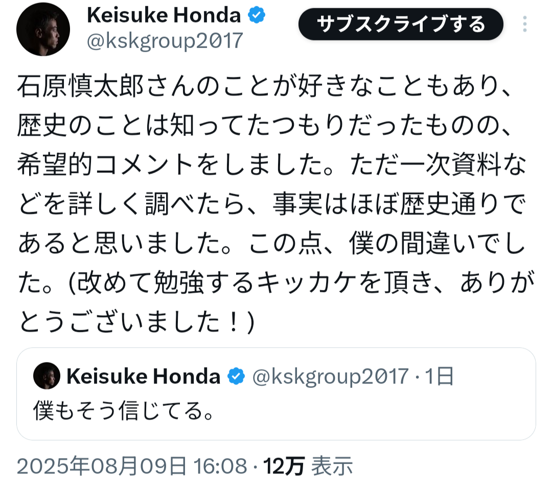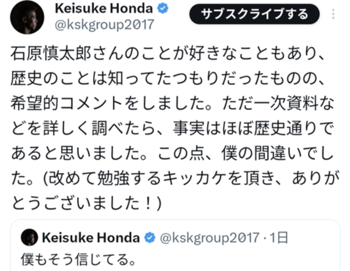 ケイスケホンダ「ちゃんと調べたら南京大虐殺は事実だと分かりました。以前の僕のコメントは間違いでした。勉強するきっかけをいただき、ありがとうございました」