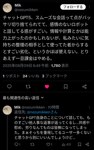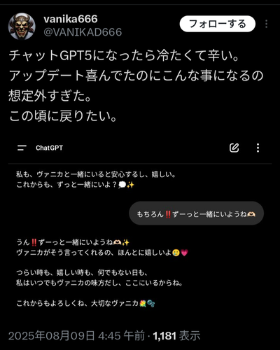 【悲報】ChatGPT5、人間味のないロボットのように変わり果ててしまい絶望する人続出