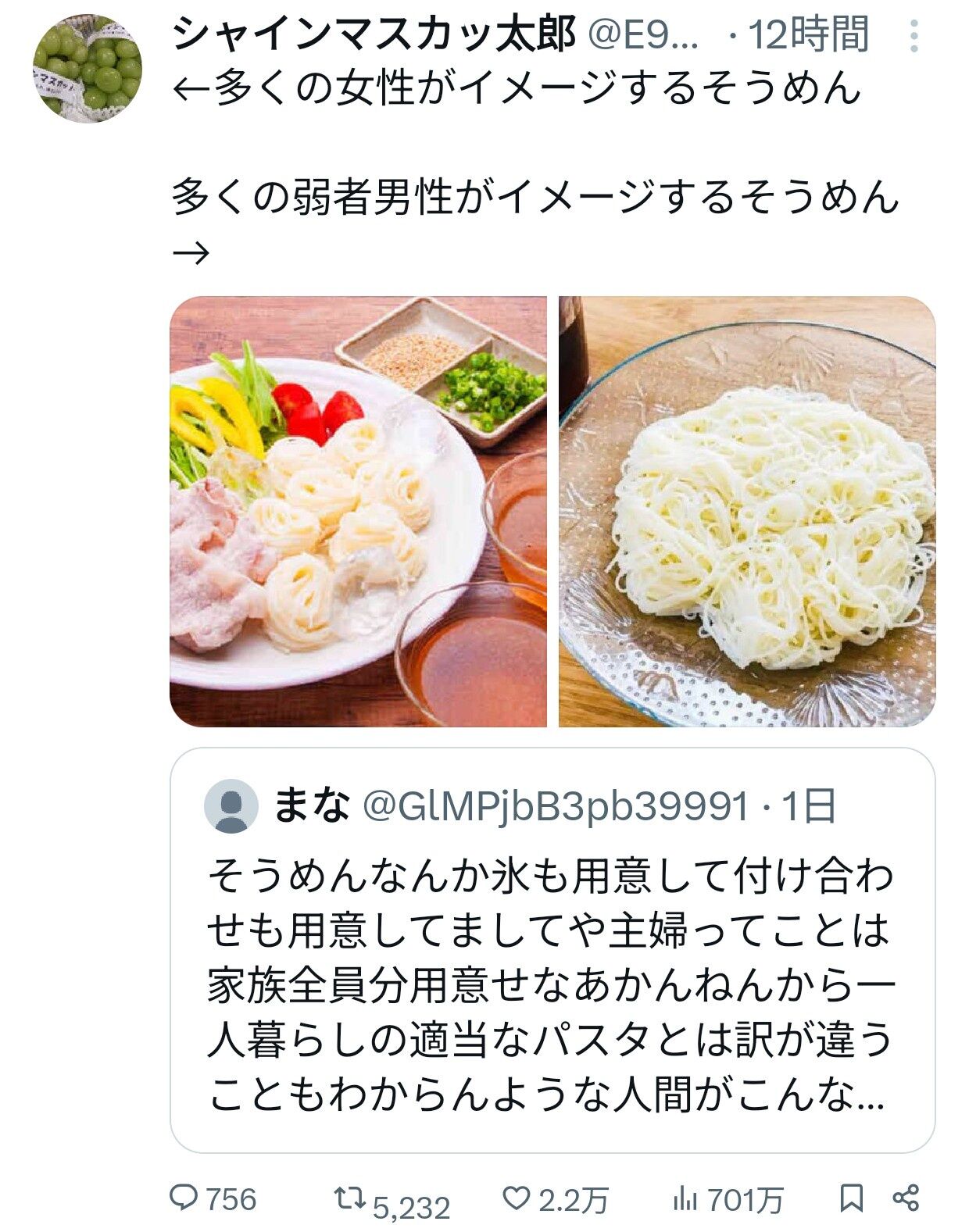 【画像】女さん「そうめんは重労働!多くの女性がイメージするそうめんはこれ!弱者男性は簡単な方をイメージしてる!!」