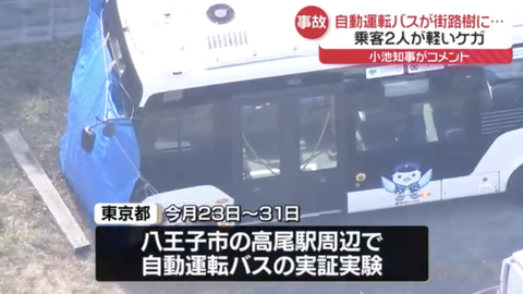 自動運転の実証実験中のバスが道路脇の街路樹に突っ込み、乗客12人のうち2人が軽いケガをしたということです。