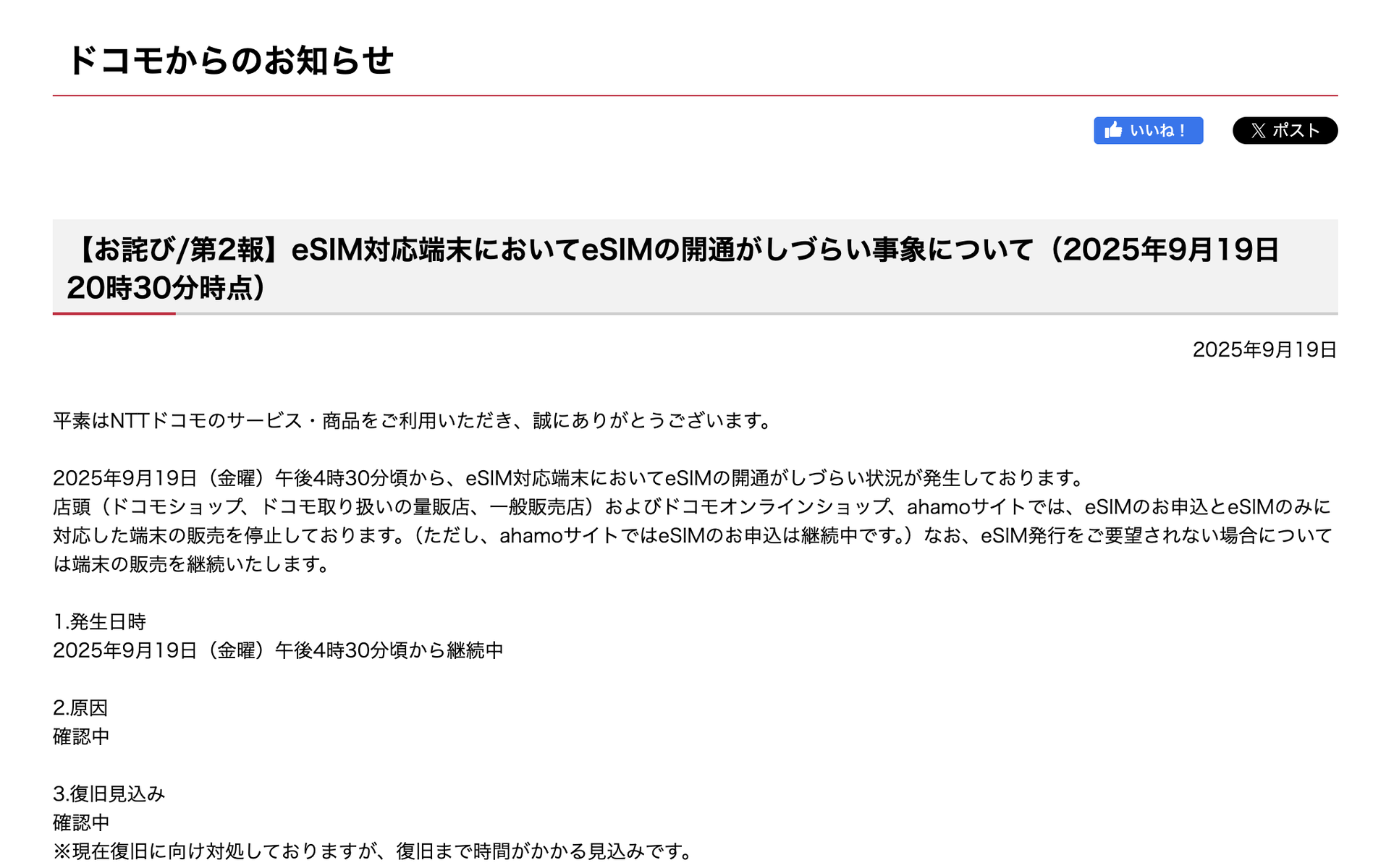 2025年9月19日(金曜)午後4時30分頃から、eSIM対応端末においてeSIMの開通がしづらい状況が発生しております。