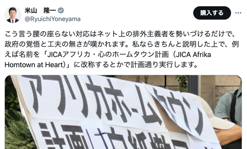 こう言う腰の座らない対応はネット上の排外主義者を勢いづけるだけで、政府の覚悟と工夫の無さが嘆かれます。私ならきちんと説明した上で、例えば名前を「JICAアフリカ・心のホームタウン計画(JICA Afrika Homtown at Heart)」に改称するとかで計画通り実行します。https://t.co/1Z2GmTvi7b