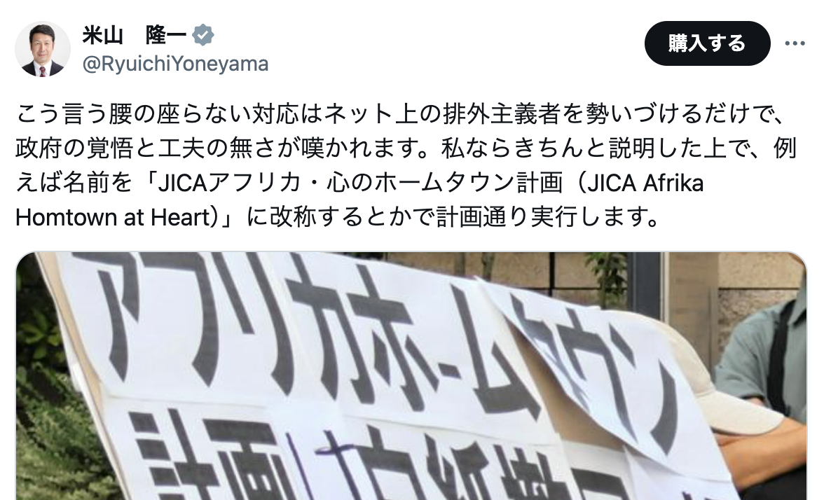 立憲の米山隆一氏「ネット上の排外主義者を勢いづけるだけ」JICA「ホームタウン」撤回報道に