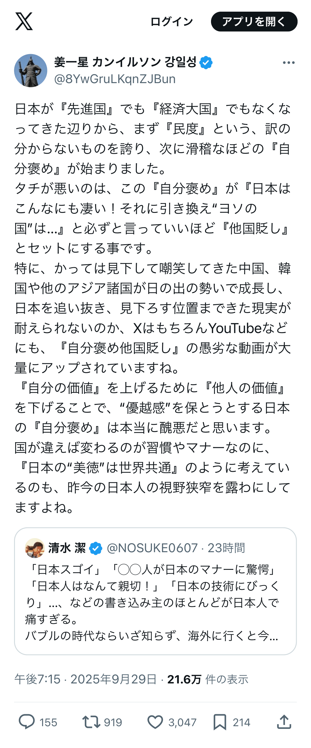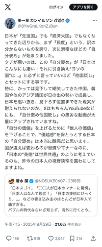 【悲報】韓国人「日本人は『民度』を誇りにし、『自分褒め』『他国貶し』が大好き」