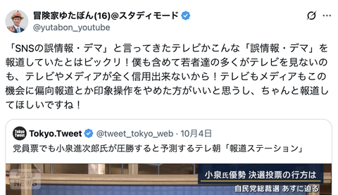 ゆたぼん「僕も含めて若者達の多くがテレビを見ないのも、テレビやメディアが全く信用出来ないから!」