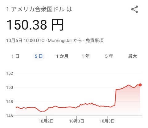 【速報】1ドル150円、大台突破。日本円が紙くずになる前に急いで退避しないと終わるぞこれ